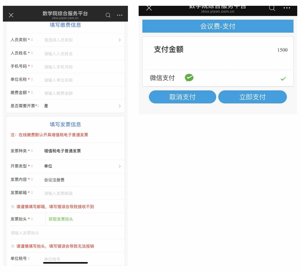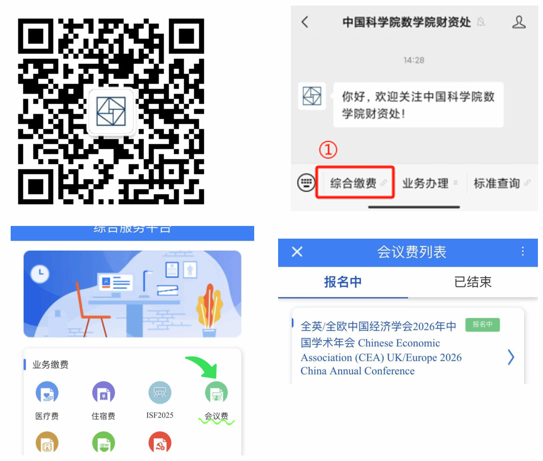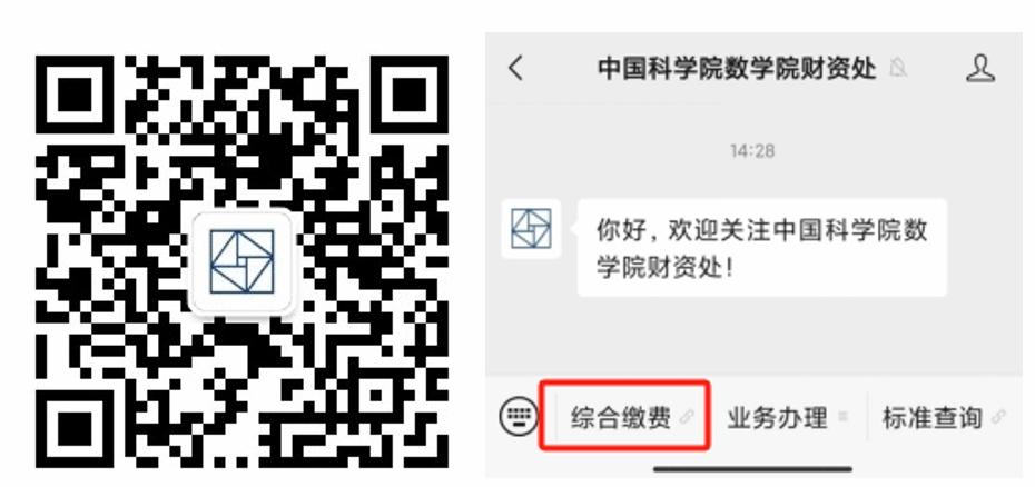 2.关注公众号缴费:用户关注微信公众号“中国科学院数学院财资处”,进入“综合缴费”服务选择“会议费”,选择本次会议