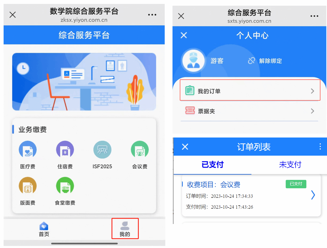 2.点击“我的”进入个人中心,在“我的订单”中选择已支付数据进行申请退款操作
